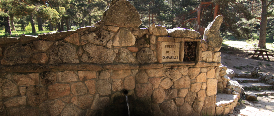 Tras pasar dicha zona, el siguiente punto de referencia es el desvío que debe tomarse para llegar a nuestro objetivo; éste aparece justo en una curva de la pista (en las fotos de la ruta se indica dicho desvío). Desde el desvío tan sólo queda ascender los metros finales para llegar a la Fuente de la Campanilla; dicho nombre procede por la campana existente en la fuente, ubicada en un hueco de la roca. En este punto encontramos una pequeña pradera con bancos y mesas para poder comer.